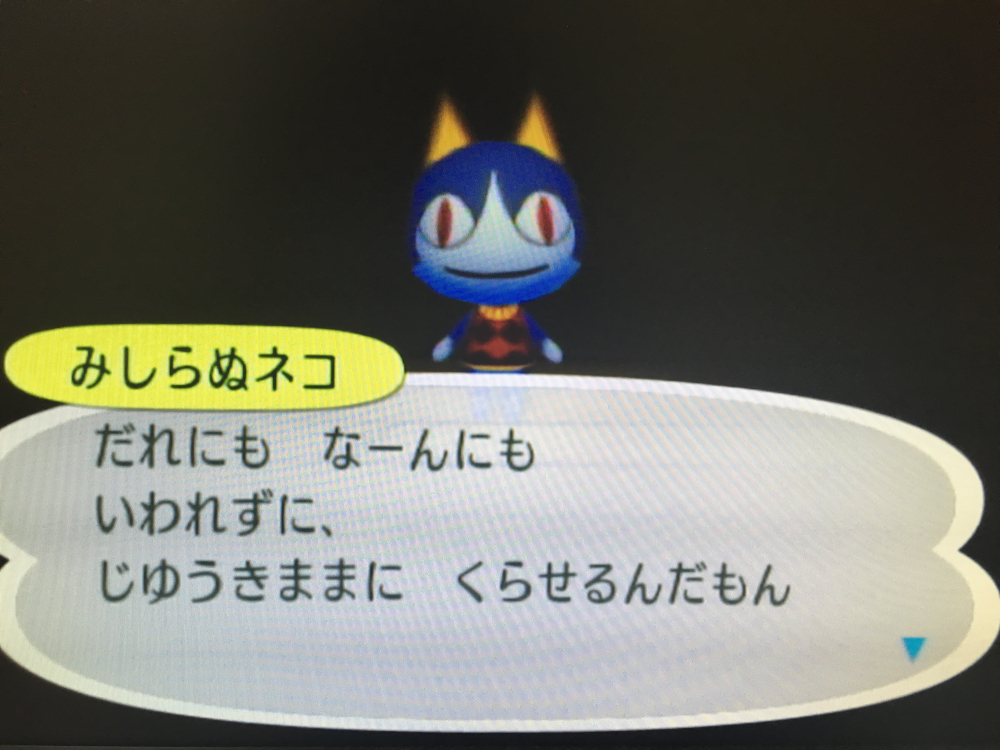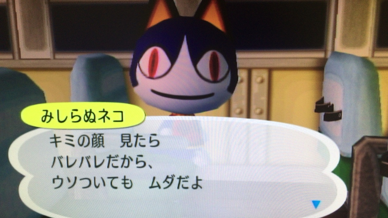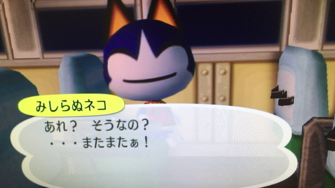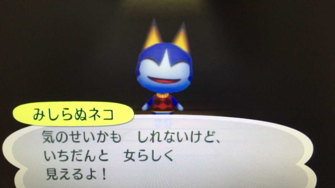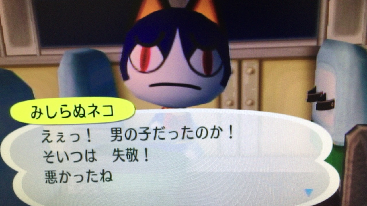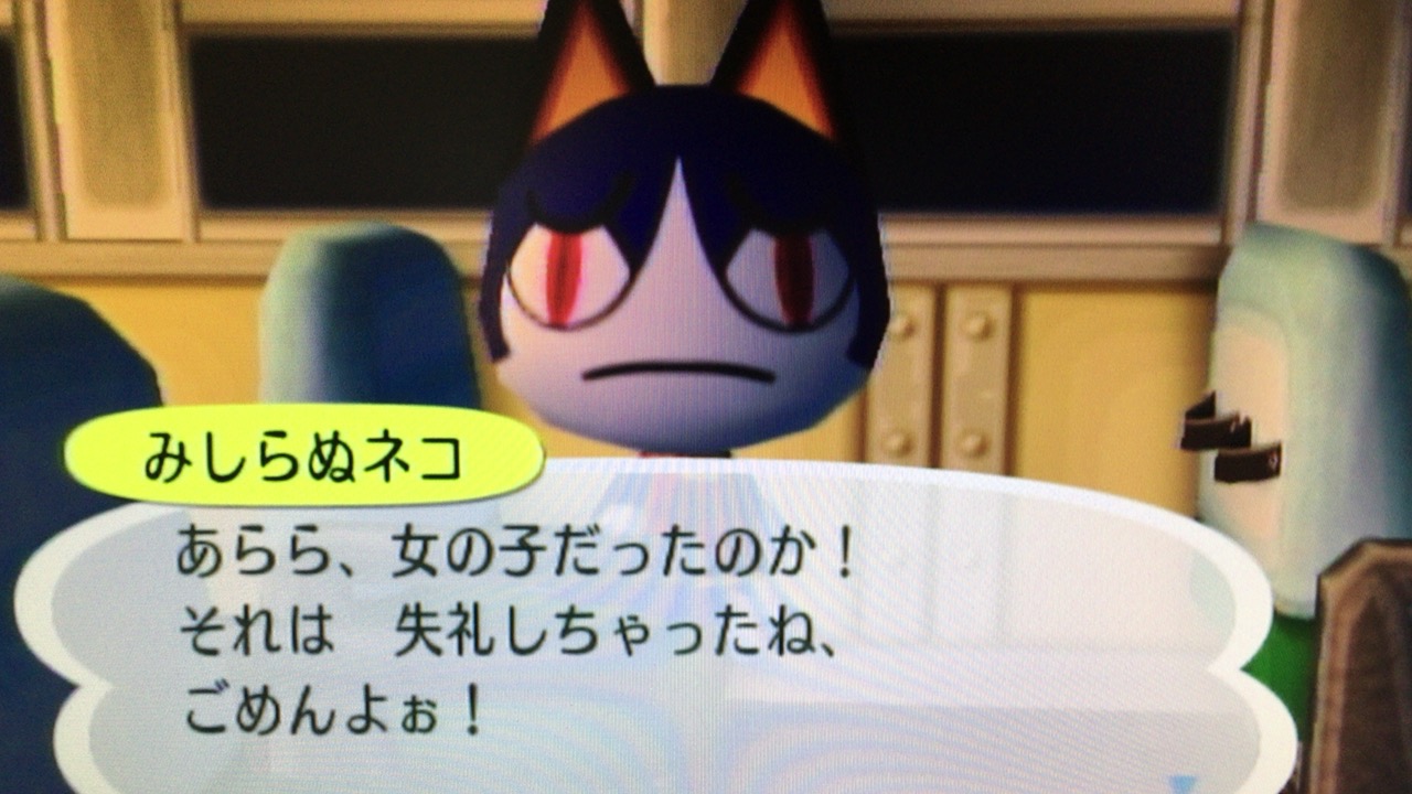 街へいこうよ どうぶつの森 みしらぬネコまとめ どうぶつの森 2018年03月21日 0 街森のみしらぬネコの登場シーンのまとめです。 初っ端から案内役をやってくれます。 自由が好きなみしらぬネコさん。 村へ向かうバスに乗ります。 「女じゃないぞ!」を選択した場合。 「カッコイイだろ!」→「男じゃないもん!」を選択した場合。 この誤り方の差…。ごめんよぉ!って。 世渡りが上手そうなのはネコさんの方ですけどね! 別の会話パターンで好きなやつ 全てを見透かす目をしていますよね。 そしてお別れ…。 家の電話はみしらぬネコさん直通です。 ネコさんとおしゃべりしたいのに、設定に関する話しかさせてくれない。 ログイン時は毎回出てきてくれます。 しばらくログインしてなかった時。 毎日ログインしてる時。 誕生日も祝ってくれます! 「楽しい1日にしてね!」みたいなセリフを想像してたら、コレですよ。 以上!